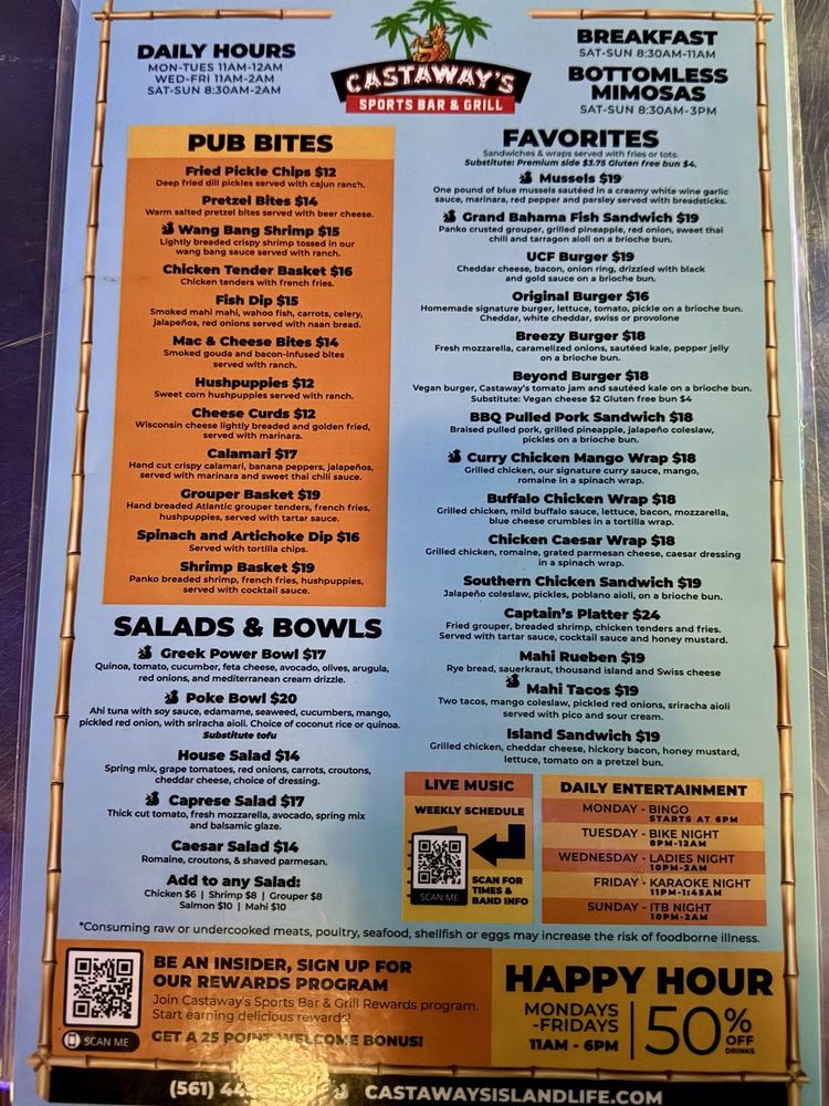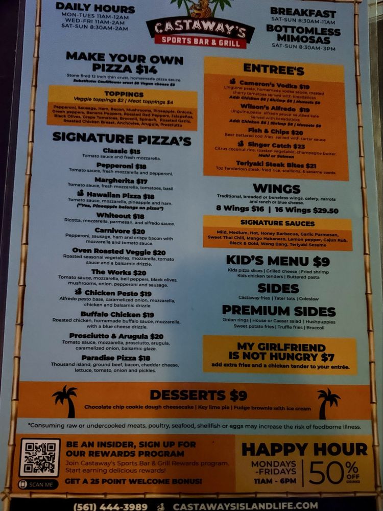 Castaway's Sports Bar and Grill Singer Island is a vibrant sports bar located at 2415 N Ocean Ave Riviera Beach, FL 33404. This establishment offers a variety of amenities, including delivery, takeout, vegetarian options, wheelchair accessibility, outdoor seating, and free Wi-Fi. With features like live music, happy hour specials, a full bar, and a pool table, Castaway's provides a lively atmosphere for patrons to enjoy. The menu features delicious pizzas and other bar favorites, with options for catering available. The restaurant also offers street parking, bike parking, and drive-thru service. Overall, Castaway's Sports Bar and Grill Singer Island is a must-visit destination for those looking for a fun and delicious dining experience.